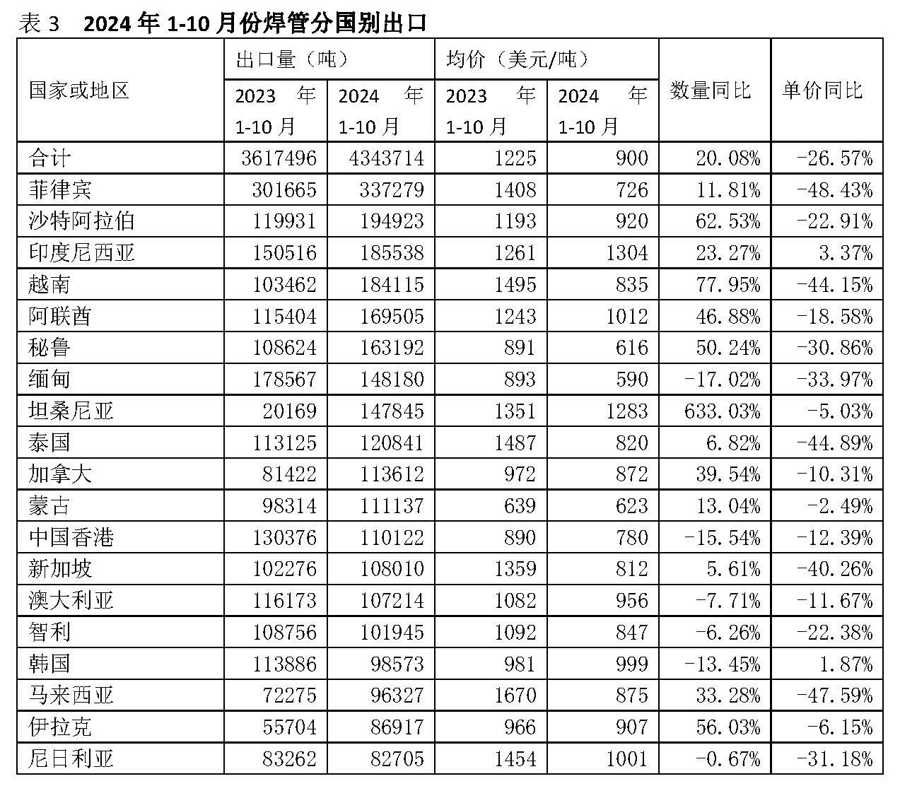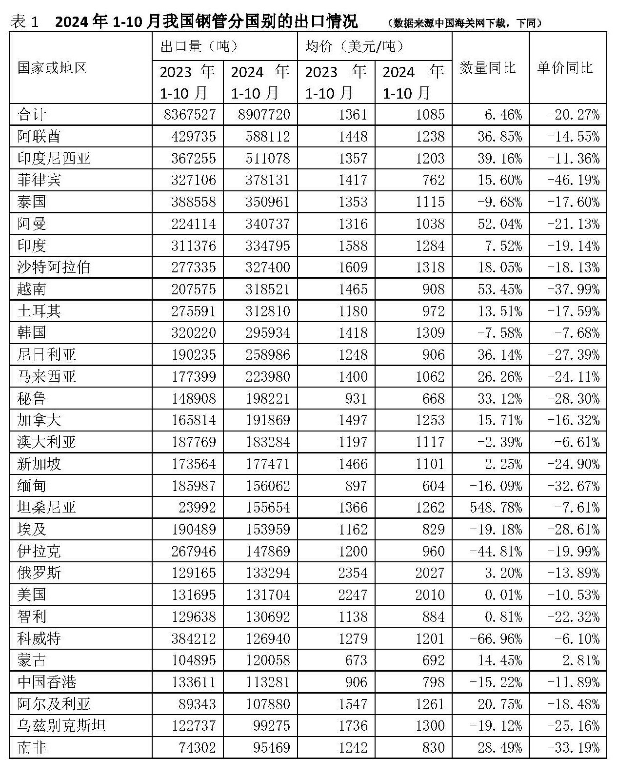 2024年1-10月我国钢管出口890.77万吨,同比6.46%。出口均价1085美元/吨,同比-20.27%。出口的主要国家详见表1。