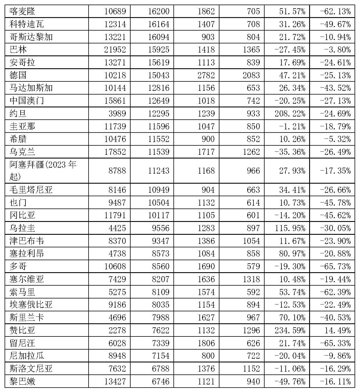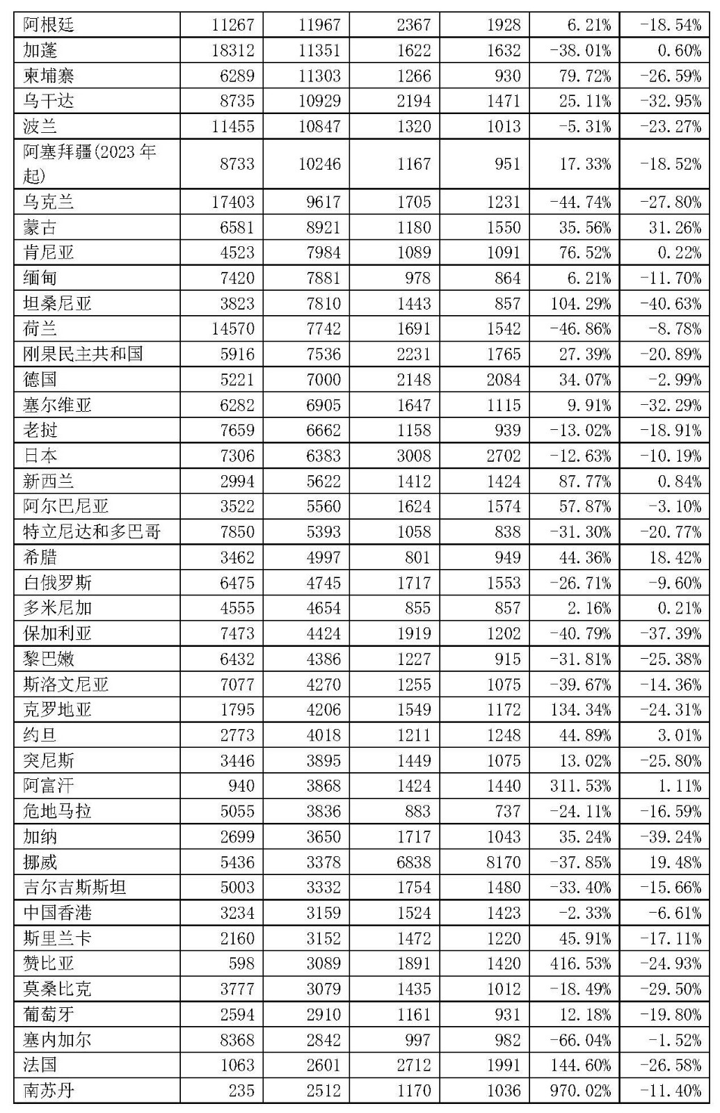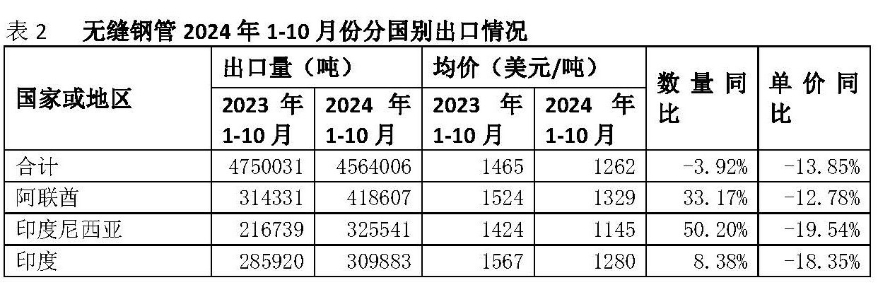 无缝钢管2024年1-10月份456.40万吨,同比-3.92%,价格1262美元/吨,同比-13.85%。主要出口国家或地区见表2。