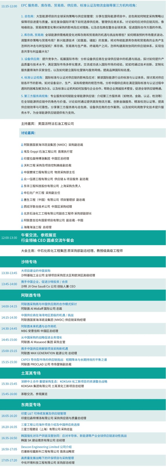 土耳其、东南亚、俄罗斯、孟加拉专场:分别聚焦中土化工项目资源整合、东南亚新能源与传统能源协同采购、俄罗斯 SIBUR 化工装备采购创新实践,以及孟加拉重大项目合作潜力。