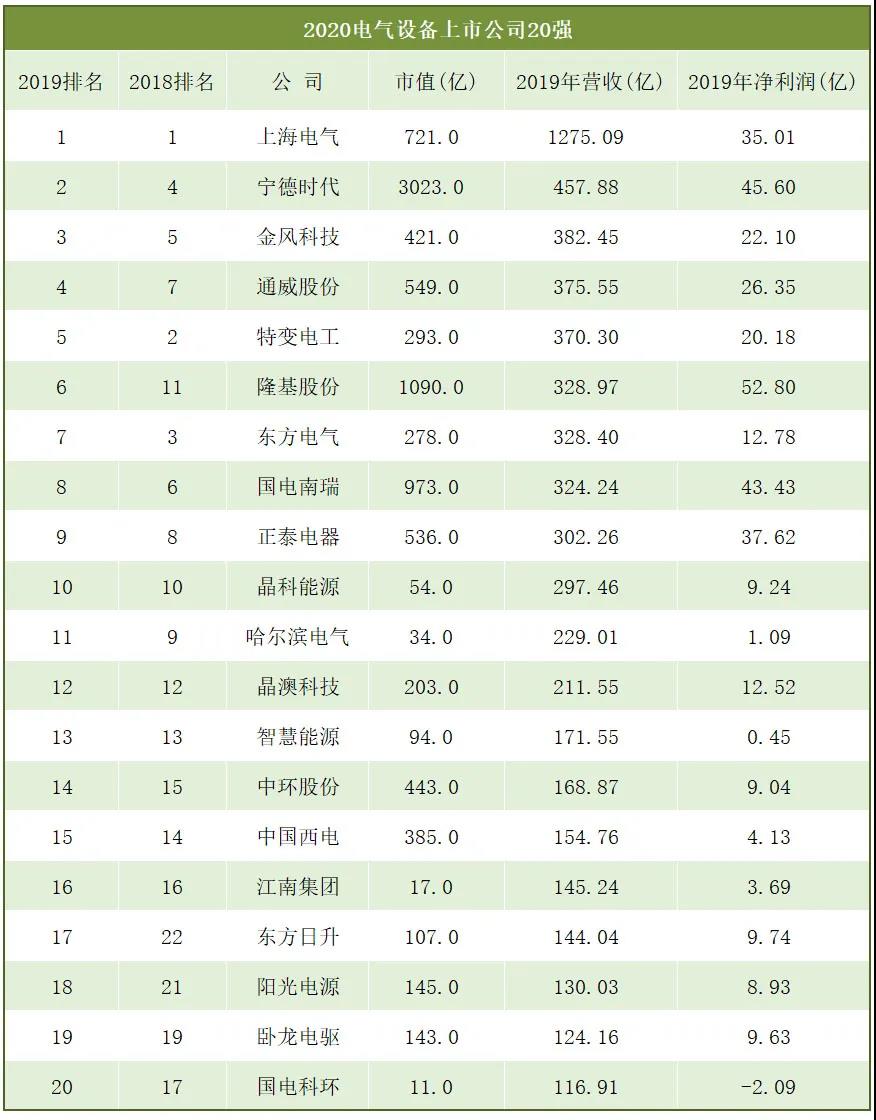 当前,在内地、香港和美国上市的电气设备企业超过了250家,既有传统电气企业,也有储能、光伏等新能源企业。2020年4月底,所有上市公司均公布了2019年财报,根据相关财报统计和分析,《能源》杂志联合领航智库,发布了《2020年电气设备上市公司20强》榜单,旨在通过企业营收、市值、利润等相关指标的排名及其变化,发现其中的规律,为投资者做决策参考。