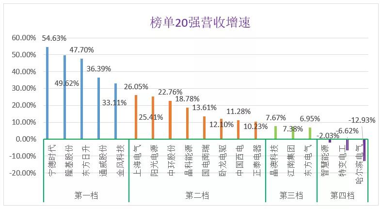 从下表可见,在营收增幅上,新能源企业独占鳌头。我们将榜单20强的营收增速分为四档,营收同比增幅在30%以上为第一档,10%-30%为第二档,0-10%为第三档,0%以下为第四档。