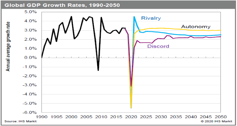 Rivalry情景:全球经济在2021-2022年迅速反弹,2023-2025年又迅速回落(低于2026-2050年)。