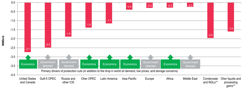第二,受到低油价和高库存的影响,全球石油供应呈现出主动减产和被动关停并行的特征,俄罗斯、沙特等OPEC+产油国达成了减产协议,主动合作削减产量,而美国、加拿大和拉美、亚太、非洲等地区的非OPEC+产油国则被迫关停高成本油井。