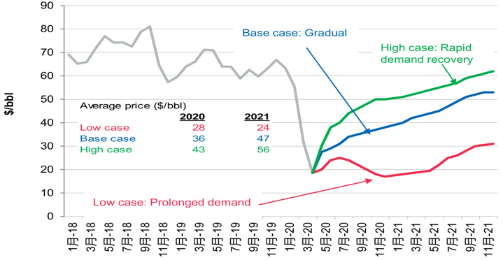 (1)基准情景:布伦特均价2020年36美元/桶,2021年47美元/桶。