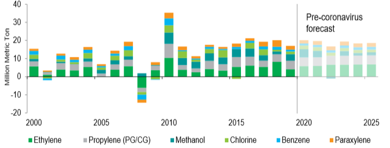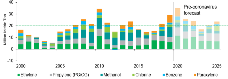 2020年将是世界基础石化产品产能投放规模最大的一年,其中相当部分的新增产能来自2016-2019年间建设项目。在需求衰退的背景下,这无疑加大了当下供需失衡的风险,进而导致行业利润下降,高成本装置关停和项目规划放缓,其中未进入的FID阶段的项目都将面临延期,进而导致长期产能增长放缓,预计2024-2025年世界石化将经历一轮新增产能低潮。