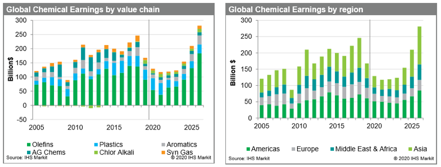因供需基本面失衡加剧,原油价格大幅下跌,石化产品价格失去供需和原料的支撑,将紧贴成本波动,直至需求复苏和油价明显回升。但对于不同原料路线的装置而言,利润表现出现分化。因石脑油价格随油价大幅下跌,而轻烃原料价格基本没有显著变化,导致全球石化装置成本曲线被“拉平”,紧贴市场的石脑油为原料的装置利润将表现强劲,但其他地区装置利润不容乐观。整体看,2020年世界石化行业利润将比2019年下跌20%左右,因供需失衡状况难以改善,2021年还将再下跌10%,预计随着供需再平衡,直至2024年整体行业利润才会出现复苏。
