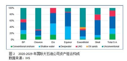 总体上,常规陆上和浅水资产的产量占国际大石油公司油气总产量的比重将持续下降,该比例从2009年的72%降至2019年的52%,IHS预计到2030年,该比例将降至40% 以下(见图1)。资产组合构成上,雪佛龙和埃克森美孚非常规资产占比将超过60%,壳牌和挪威国油的深水资产占比将超过40%,道达尔、壳牌和埃尼的LNG资产将占20%左右(见图2)。