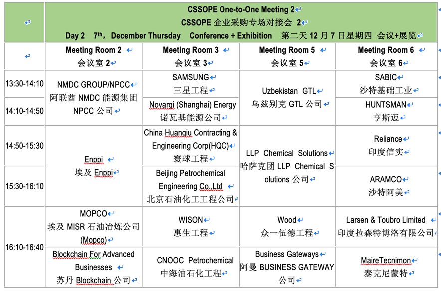 为期两天的CSSOPE 2023,将设置国际采购专场、国内采购专场、一带一路采购专场、新能源新材料采购专场、以及国内外多个知名企业的一对一供采对接会。如:三星工程、NMDC GROUP旗下NPCC、埃及 Enppi、 Tatneft 鞑靼石油 、白俄罗斯石油公司 JSC Grodno Azot Khimvolokno 化工厂 、白俄罗斯JSC Mozyr Oil Refinery 莫济里炼油厂 、白俄罗斯OJSC NAFTAN NAFTAN 总部、白俄罗斯NAFTAN POLYMIR炼油厂、乌兹别克团:GTL公司、印度信实、哈萨克团LLP Chemical Solutions公司、印度拉森特博洛有限公司、众一伍德工程、诺瓦基(上海) 能源公司等采购对接专场。