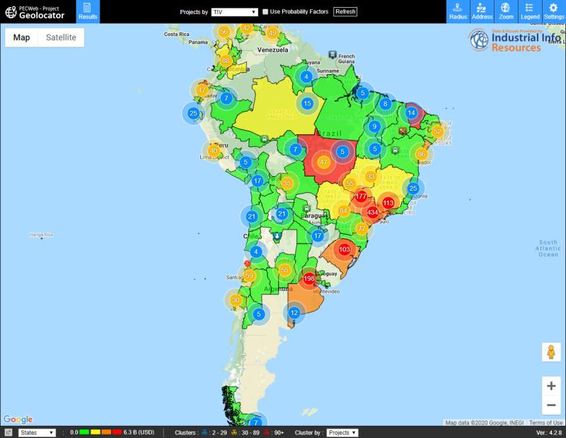 Industrial Info Resources追踪报道的炼油以及化工行业项目分布图:南美。总项目数量 2218个,投资额达 309.6亿美元。通过IIR的Geoloca...